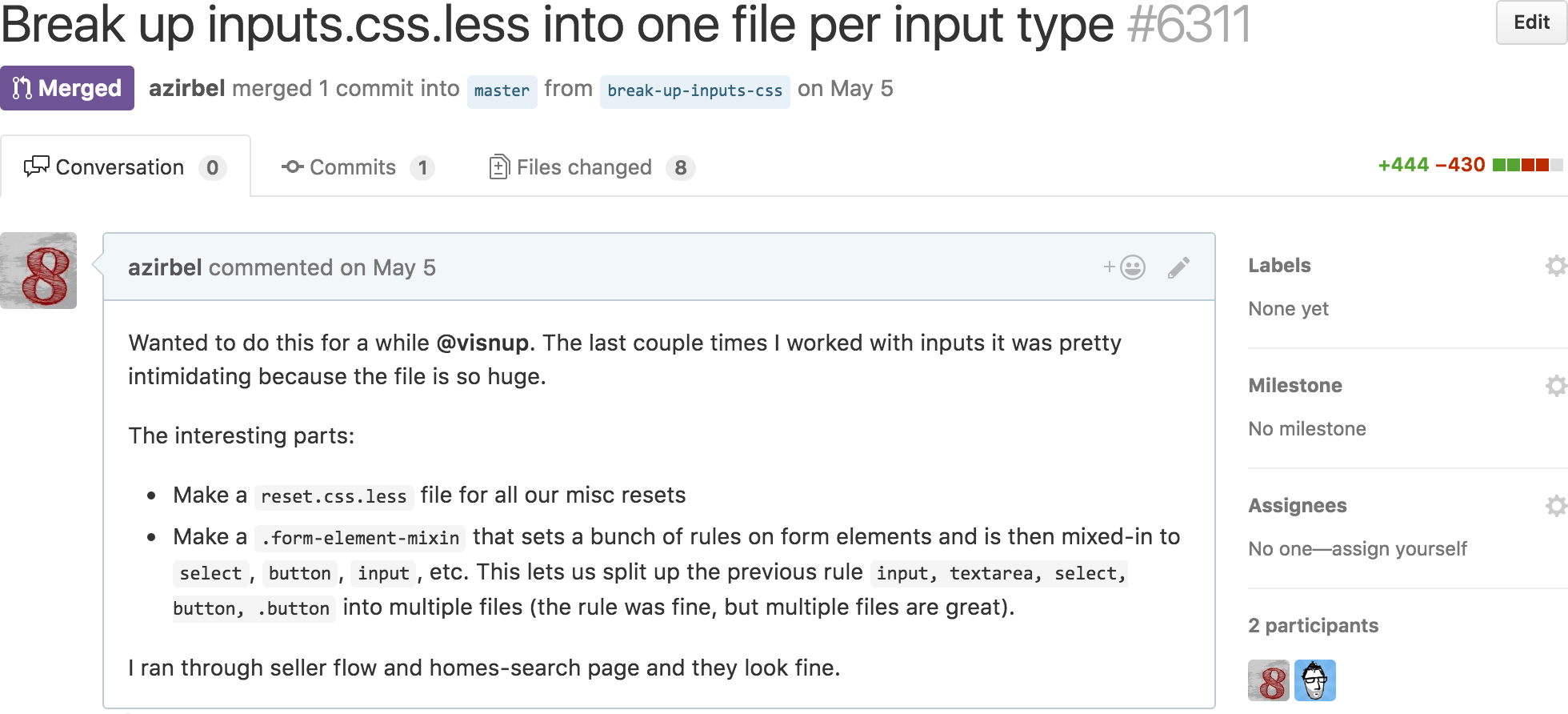 I found a CSS file that was 422 lines long, and could be broken up into multiple files. I broke it up. (That was actually a change I'd been wanting to make anyway.)